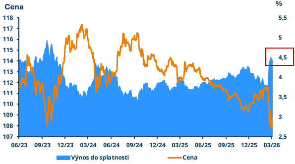 Obrázek: Výnos do splatnosti a cena 5tiletého českého státního dluhopisu (20.3.2026):